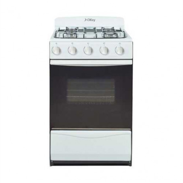 Cocina Okey Petit blanca 51 cm Multigas. Cuatro hornallas. Sin parrilla. Válvula de seguridad en todos los quemadores. Puerta de horno de cristal